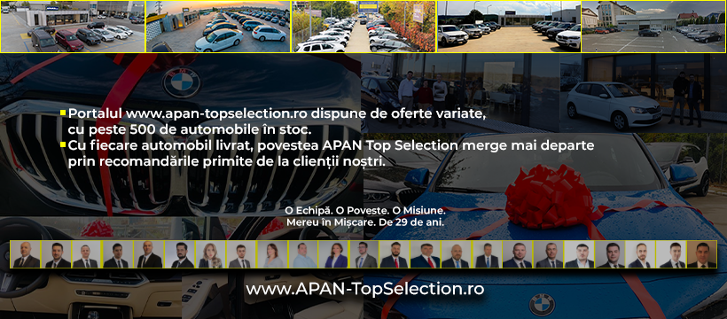 APAN Top Selection, prin transparența serviciilor oferite, îți pune la dispoziție oferte personalizate și consultanță în alegerea unui automobil nou sau rulat. Pentru că experiența achiziției unui automobil prin APAN Top Selection este importantă, o echipă profesionistă este gata în orice moment să îți ofere servicii complete de finanțare convenabilă, servicii de întreținere și reparație, soluții de mobilitate, dar și consiliere în vederea schimbării autovehiculului prin sistemul buy-back.